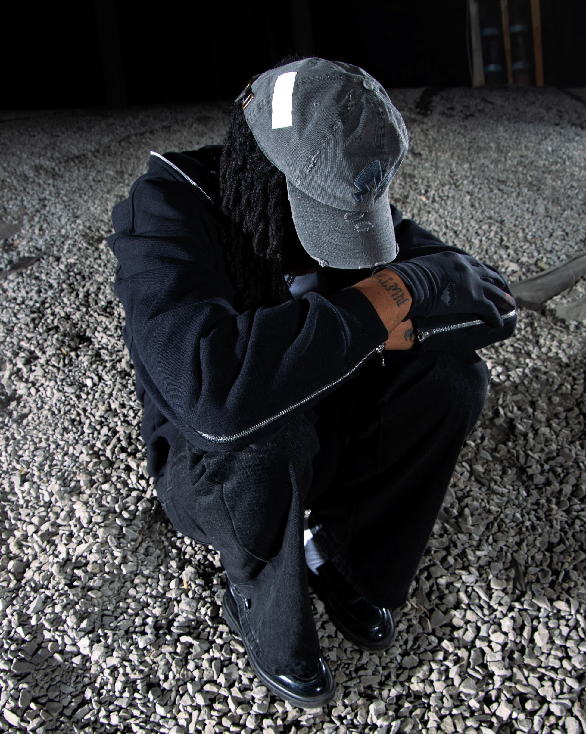 Washed black unstructured 5 panel, buckle strap